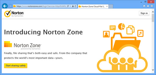 1.使用瀏覽器進入 Norton Zone Cloud Sharing 網站,點擊[Start sharing safely]來開始註冊程序。