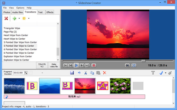 首頁電腦軟體影像繪圖 Bolide Slideshow Creator 相片製作成幻燈片免費軟體 想要將照片製作成影片來播放,可以來使用 Bolide Slideshow Creator 這套可將相片製作成幻燈片的免費軟體,操作步驟簡單又直覺,具有可搭配自選的背景音樂、豐富的相片轉場效果、相片加入文字說明與放大等功能,完成製作後,可輸出成 AVI、WMV、MKV 的影片格式,且支援 240/480/720/1080等多種影片解析度,讓相片不失真,相當實用。 🔔 不錯過任何精彩! 立即訂閱我們的 LINE 官方帳號 每次發佈新文章時,您將會第一時間收到本站文章連結通知,輕鬆掌握最新資訊! 使用 LINE 追蹤文章更新 §相關文章,還可以參閱:告別訂閱制!Canva 旗下 Affinity 永久免費,向量設計、影像處理、排版工具全面開放Pineapple Pictures 載入速度超快的相片檢視器(免安裝)PhotoResizerOK 可快速調整圖片尺寸的免費軟體ShortDoorNote 將輸入的文字快速轉成圖片Bzzt! Image Editor 圖片批次壓縮、轉檔及尺寸調整的免費工具 如何使用Bolide Slideshow Creator? 1.開啟 Bolide Slideshow Creator 應用程式後,可在 Photos 與 Audio files 頁籤,來加入相片與音樂,並使用滑鼠拖曳到下方的播放格中。 2.Transitions 頁籤,可讓我們加入相片與相片之間的轉場效果,同樣是以滑鼠拖曳的方式。 3.Text 頁籤,可讓我們加入圖片的文字說明。 4.Effects 可加入相片放大的效果。 5.完成製作後,點擊[File] > [Save as video file...]便可選擇要儲存的影片格式及其解析度。 Bolide Slideshow Creator版本:2.2語言:英文性質:免費適用:Windows官方網站:https://slideshow-creator.com/下載:按我下載