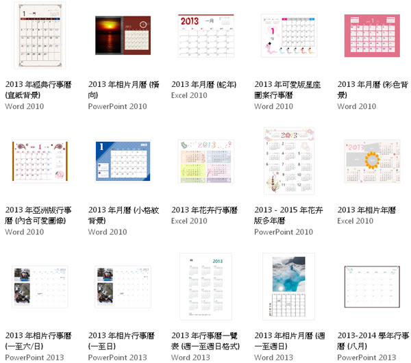 首頁線上工具生產力工具 2013 年 Microsoft Office 行事曆與月、年曆免費下載 若要製作中華民國 102年、西元 2013年的行事曆,可到微軟 Office 的範本藝廊來下載,有 Word、PowerPoint、Excel,均使用 Office 各版本所製作,相當多樣式,除了常見的樣式外,也有相片、學術、星座行事曆、橫向簡易月曆 (附農曆,每個月一頁)、月曆 (週日至週六,含農曆)...相當多樣式,可供挑選。 🔔 不錯過任何精彩! 立即訂閱我們的 LINE 官方帳號 每次發佈新文章時,您將會第一時間收到本站文章連結通知,輕鬆掌握最新資訊! 使用 LINE 追蹤文章更新 §相關文章,還可以參閱:ChatGPT Go 月付 290 元值得嗎?免費版、Plus 完整比較用 AI 做出的電影,YouTube 就看得到!一起來欣賞這部贏得百萬美元的突尼西亞短片《Lily》Apple Creator Studio 來了:Final Cut Pro、Logic Pro 等九款 App 月付 390 元,學生優惠僅 90 元ChatGPT 智慧購物功能登台!台灣用戶也能用 AI 做商品研究與比價2026學生專屬福利:從AI工具到雲端服務,10+款專業軟體免費/折扣全攻略 如何下載 Microsoft Office 2013 年各樣式月、年曆? 1.進入前述網址後,便可看到各樣式的列表。 2.找到自己喜愛的樣式後,點擊該樣式即可預覽、下載。 Office 範本藝廊網站網址:http://office.microsoft.com/zh-tw/templates/results.aspx?qu=2013&ex=1&tl=2