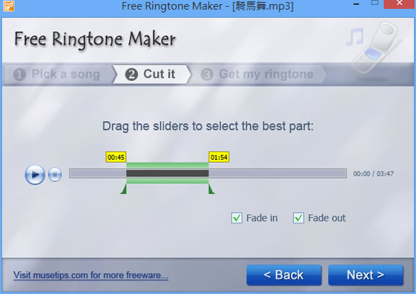 首頁電腦軟體影音視聽 Free Ringtone Maker 手機鈴聲製作免費軟體 對於喜歡的音樂片段,想要將它變成手機鈴聲時,可以來使用 Free Ringtone Maker 這套可剪輯 MP3 音樂的手機鈴聲製作免費軟體,步驟明確,無製作門檻,所剪輯的音樂片段前後還可以加入聲音的漸增與淡出,簡單好用。 🔔 不錯過任何精彩! 立即訂閱我們的 LINE 官方帳號 每次發佈新文章時,您將會第一時間收到本站文章連結通知,輕鬆掌握最新資訊! 使用 LINE 追蹤文章更新 §相關文章,還可以參閱:超實用免費軟體!DCP-o-matic 讓你的影片變成電影院 DCP 播放格式語音轉文字免費工具 AsrTools 輕鬆搞定字幕、筆記或歌詞整理免費的 PotPlayer 開始搭載 Whisper AI,讓你即時生成字幕與翻譯,外語影片輕鬆看SpleeterGUI:簡單易用的 AI 音軌分離免費開源工具如何使用 Microsoft Clipchamp 自動產生影片字幕? 1.安裝時,請注意選擇避免安裝與 Free Ringtone Maker 功能無關的應用程式(不想安裝請點擊[Decline])。 2.完成安裝開啟 Free Ringtone Maker 後,可看到明確的三個步驟,首先點擊[Choose a Song from My Computer]來選擇電腦內的 MP3 檔案(Convert Mono Songs to Stereo 為另套付費軟體)。 3.選擇好 MP3 檔案後,會自動進入剪輯的第二步驟,可用滑鼠拖拉所要的音樂片段並進行試聽,其中[Fade in]與[Fade out]分別為聲音漸增與淡出,完成片段選擇,點擊[Next>]。 4.接下來會進行剪輯動作,完成後,點擊[Locate in Windows Explorer]便會開啟檔案總管到經過剪輯的檔案所在位置。 Free Ringtone Maker版本:2.5語言:英文性質:免費適用:Windows官方網站:http://www.musetips.com/free-ringtone-maker.html下載:按我下載