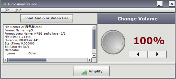首頁電腦軟體影音視聽 Audio Amplifier Free 影片、MP3 音量調整免費工具 2014-5-14 更新:該軟體已變為共享軟體,不再免費 在聽 MP3 或是看影片時,常有些音量特別小聲,需要手動來調整音量,相當麻煩,若有這個困擾,可以來使用 Audio Amplifier Free 這套可對影片及音頻做音量調整的免費工具,支援絕大多數常見的影音格式,且使用簡單。 🔔 不錯過任何精彩! 立即訂閱我們的 LINE 官方帳號 每次發佈新文章時,您將會第一時間收到本站文章連結通知,輕鬆掌握最新資訊! 使用 LINE 追蹤文章更新 §相關文章,還可以參閱:超實用免費軟體!DCP-o-matic 讓你的影片變成電影院 DCP 播放格式語音轉文字免費工具 AsrTools 輕鬆搞定字幕、筆記或歌詞整理免費的 PotPlayer 開始搭載 Whisper AI,讓你即時生成字幕與翻譯,外語影片輕鬆看SpleeterGUI:簡單易用的 AI 音軌分離免費開源工具如何使用 Microsoft Clipchamp 自動產生影片字幕? 如何使用Audio Amplifier Free? 完成安裝,開啟 Audio Amplifier Free 後,點擊[Load Audio or Video File]來加入要調整音量的影音檔案,接下來,使用滑鼠拖動音量按鈕到理想音質,再點擊[Amplify]即可。 Audio Amplifier Free版本:1語言:英文性質:共享適用:Windows官方網站:http://www.dandans.com/Audio-Amplifier-Free.htm下載:按我下載