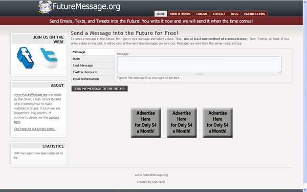 首頁線上工具未分類 FutureMessage.org 發送訊息到未來(EMail、簡訊、Twitter)! 如果想要將現在的心境或想說的話,發送給10年後的自己或親朋好友,現在FutureMessage.org 這個網站可以幫你達成這個任務,也許當自己收到該訊息,在回想以前可能會有不一樣的回憶吧,目前FutureMessage.org 該網站提供的傳送訊息的方式為EMail、簡訊、Twitter。 🔔 不錯過任何精彩! 立即訂閱我們的 LINE 官方帳號 每次發佈新文章時,您將會第一時間收到本站文章連結通知,輕鬆掌握最新資訊! 使用 LINE 追蹤文章更新 §相關文章,還可以參閱:Google 親揭爆紅 AI 模型為何叫「Nano Banana」,答案出乎意料「半夜亂取的名字」爆紅全球!Google揭密 Nano Banana 命名背後的意外故事Luckydraw:最佳線上抽獎工具,適合尾牙、婚禮及各項活動抽獎How Old Do I Look:免費線上 AI 年齡分析工具,輕鬆測試你的看起來年齡Google 宣布 goo.gl 縮址服務即將停止 ,但已建立的永久有效 如何使用FutureMessage.org 所提供的服務? 1.登入FutureMessage.org的網站後,在Message頁籤的輸入框內輸入要傳送的訊息。 2.輸入要傳送的訊息後,點擊[Date],輸入要傳送的日期 3.輸入要傳送的日期後,若要使用簡訊傳送,可點擊[Date],輸入電話號碼及簡訊服務廠商(應該不含台灣)。 4.若要使用Twitter,點擊[Twitter Account],輸入Twitter的帳號及密碼。 5.若要使用EMail傳送,點擊[EMail Infomation],輸入要接收的電子郵件地址。 6.以上的傳送方式擇一即可,確定好之後,點擊[SEND MY MESSAGE TO THE FUTURE!]就可以完成發送任務。 FutureMessage.org網站網址:http://futuremessage.org/