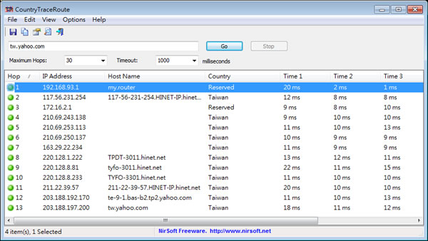 首頁電腦軟體網路應用 CountryTraceRoute 路由器路徑追蹤工具 我們都知道當 IP 要對外存取時,會透過子網路遮罩來判斷目地的的電腦是否在同一個網段,若不是,則會透過路由器來選擇路徑,CountryTraceRoute 是一個路由器路徑追蹤工具,只要輸入網址或 IP,就可以查詢由本機電腦出發所經過路由器的 IP 位址、回應時間等,另外,CountryTraceRoute 還會顯示 IP 所屬的國家,還可以將查詢的結果匯出為 HTML 格式,所得數據可用來診斷網站連線的問題。 🔔 不錯過任何精彩! 立即訂閱我們的 LINE 官方帳號 每次發佈新文章時,您將會第一時間收到本站文章連結通知,輕鬆掌握最新資訊! 使用 LINE 追蹤文章更新 §相關文章,還可以參閱:Bright VPN 提供覆蓋全球60多個位置的免費 VPN服務WhoisThisDomain 網域名稱註冊資料免費查詢工具PingInfoView 可自訂時間 PING 自訂的 IP 或網域並發出通知Wireless Network Watcher 找出有哪些裝置正在連你的無線網路IPNetInfo IP 資訊查詢工具 如何使用 CountryTraceRoute? 1.解壓縮所下載的檔案後,執行「CountryTraceRoute.exe」便可開啟,無須安裝。 2.在 輸入 IP 或 網址,點擊[Go]便可開始追蹤,可點擊[View] > [HTML Report]將查詢結果匯成 HTML 格式。 CountryTraceRoute版本:1.40語言:英文性質:免費適用:Windows官方網站:https://www.nirsoft.net/utils/country_traceroute.html下載:按我下載