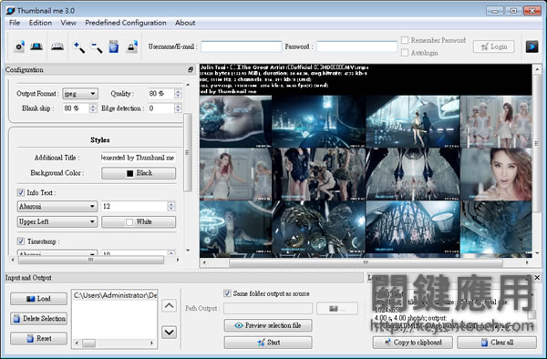 首頁電腦軟體影音視聽 Thumbnail me 為影片製作縮圖 現在有很多的手持設備都可以拿來拍攝影片,且解析度都不差,想要為這些影片製作縮圖,方便以後好辨識,可以來使用 Thumbnail me 這套免費的應用軟體,支援 avi、3gp、mkv、ts、mpeg、mp4、m4v、swf、flv....等等的影片格式,而製作的圖片則支援 bmp、png、tiff 及 jpeg 且整個製作過程相當快速。 🔔 不錯過任何精彩! 立即訂閱我們的 LINE 官方帳號 每次發佈新文章時,您將會第一時間收到本站文章連結通知,輕鬆掌握最新資訊! 使用 LINE 追蹤文章更新 §相關文章,還可以參閱:超實用免費軟體!DCP-o-matic 讓你的影片變成電影院 DCP 播放格式語音轉文字免費工具 AsrTools 輕鬆搞定字幕、筆記或歌詞整理免費的 PotPlayer 開始搭載 Whisper AI,讓你即時生成字幕與翻譯,外語影片輕鬆看SpleeterGUI:簡單易用的 AI 音軌分離免費開源工具如何使用 Microsoft Clipchamp 自動產生影片字幕? 如何使用Thumbnail me? 1.完成安裝開啟 Thumbnail me 應用軟體後,點擊左下角[Load]來載入要轉檔的影片,載入後,點擊[Start]稍後下,便可看到影片縮圖。 2.同時會彈出,可上傳到 ImageShack 的提示視窗,若想跳過,點擊[Close]即可。 3.預設轉出的圖片是與影片相同路徑。 Thumbnail me版本:3.0語言:英文性質:免費適用:Windows官方網站:http://www.thumbnailme.com/下載:按我下載