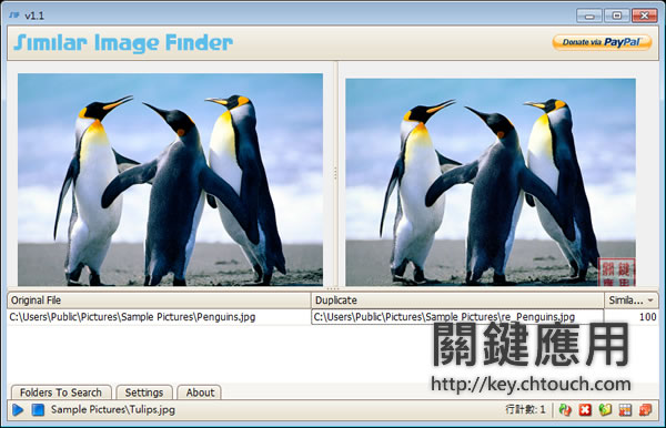 首頁電腦軟體檔案管理 Similar Image Finder 找出相似或重複的圖片 照相的時候,有時候會怕拍得不好而重複照相或是因為要做後續的處理而產生的複製...等等,想要找出重複或是相似度很高的圖片,若是靠人工來比對,然免有疏漏,這時候可以來使用 Similar Image Finder 這套免費的工具來幫你找出相似或重複的圖片,可自訂圖片的相似比例,對於找出的結果還可以放大來比較,也可整批移動到其他資料夾或刪除,相當方便。 🔔 不錯過任何精彩! 立即訂閱我們的 LINE 官方帳號 每次發佈新文章時,您將會第一時間收到本站文章連結通知,輕鬆掌握最新資訊! 使用 LINE 追蹤文章更新 §相關文章,還可以參閱:檔案好多重複怎麼辦?免費 dupeGuru 幫你一鍵清出電腦空間[ 免費使用 ]PDFgear 整合各種 PDF 工具,具格式轉換、編輯、合併或拆分等功能7-Zip 檔案壓縮與解壓縮免費軟體AmoK Exif Sorter 讓照片按拍照日期重新命名並自動分類的免費軟體PDF Unshare 限制 PDF 檔案的讀取有效日期 如何使用 Similar Image Finder? 1.完成安裝開啟 Similar Image Finder 後,將滑鼠指向左下角的 Folders To Search 頁籤,並點擊[Add Folder]來加入要搜尋的資料夾。 2.Settings 頁籤,可讓我們設定圖片的相似度。 3.設定好之後,點擊介面最左下角的三角形按鈕,便可開始搜尋。 4.若要看圖片的細部,可將滑鼠移至圖片處便會放大,找出的結果可透過介面右下角的圖示按鈕進行移動或刪除。 Similar Image Finder版本:1.1語言:英文性質:免費適用:Windows官方網站:http://www.similarimagefinder.com/下載:按我下載