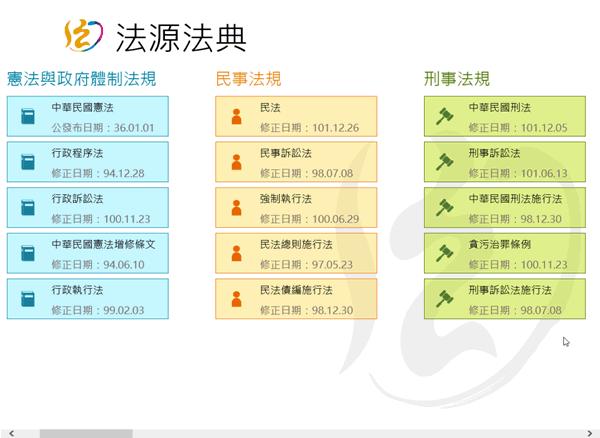 首頁移動設備生活資訊 法源法典 - 法規資料庫﹝Windows 8 App﹞ 想要考公職或是想要了解中華民國的各級法規,包括中華民國憲法(含增修條文)、民法、刑法、行政法、內政、外交、國防、財政、教育文化、法務、經濟、交通、農業、考選......等等各級法規,可以來安裝「法源法典」這個 Windows 8 的應用程式,讓你有需要的時候,便可翻閱,相當方便,另外,這些法規也可以在法務部的全國法規資料庫 中找的到。 🔔 不錯過任何精彩! 立即訂閱我們的 LINE 官方帳號 每次發佈新文章時,您將會第一時間收到本站文章連結通知,輕鬆掌握最新資訊! 使用 LINE 追蹤文章更新 §相關文章,還可以參閱:停車不再靠運氣!用 LINE「雞來客棧_GLike」機器人 3秒快速找車位Google Play 公布 2023 年度最佳遊戲及應用程式榜單「中央氣象局E-地震測報」APP即時掌握地震動態手機開啟 Google 搜尋「Pac-Man」就讓 Hello Kitty、小精靈、布丁狗及動漫人物以 3D 出現在現實環境中手機開啟 Google 搜尋動物名稱,就可利用 AR 技術將其融入到現實環境中 法源法典App介紹? 1.進入上述的安裝網址,點擊[安裝]即可。 2.點擊法源法典的動態磚,進入後,便可看到各級法規。 法源法典APP性質:免費官方網站:http://www.lawbank.com.tw/安裝網址:按我進入市集