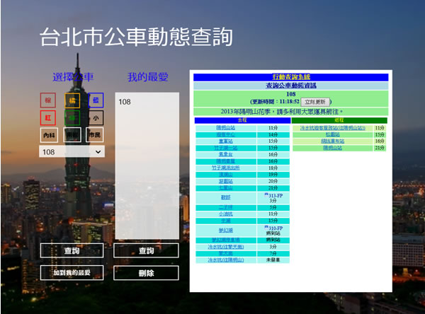 首頁移動設備生活資訊 ﹝Windows 8 App﹞台北市公車動態查詢 需要知道台北市公車目前動態,現在也可以透過 Windows 8 應用市集來安裝「台北市公車動態查詢」App,想要到台北市洽公、旅遊,搭公車的最佳幫手,包含公車所經路線,目前位置,預估到站時間等,並可將常搭的公車加入我的最愛,方便下次查詢。 🔔 不錯過任何精彩! 立即訂閱我們的 LINE 官方帳號 每次發佈新文章時,您將會第一時間收到本站文章連結通知,輕鬆掌握最新資訊! 使用 LINE 追蹤文章更新 §相關文章,還可以參閱:停車不再靠運氣!用 LINE「雞來客棧_GLike」機器人 3秒快速找車位Google Play 公布 2023 年度最佳遊戲及應用程式榜單「中央氣象局E-地震測報」APP即時掌握地震動態手機開啟 Google 搜尋「Pac-Man」就讓 Hello Kitty、小精靈、布丁狗及動漫人物以 3D 出現在現實環境中手機開啟 Google 搜尋動物名稱,就可利用 AR 技術將其融入到現實環境中 如何使用「台北市公車動態查詢」App? 1.進入上述安裝網址,點擊[安裝]即可。 2.完成安裝後,點擊[台北市公車動態查詢]動態磚,便可進入應用程式,輸入要查詢的公車編號,點擊[查詢]便可在右窗格中顯示目前班車資訊。 台北市公車動態查詢APP性質:免費官方網站:http://apps.microsoft.com/windows/zh-tw/app/6361e437-53ea-4dfe-9042-72f32ddd0643