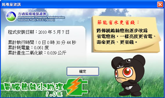 1.下載前必須先登入,若沒有帳號可免費註冊,安裝完成後,便會直接啟用,啟用完畢常駐程式列就會出現它的 ICON 了快速點兩下左鍵就可以看到您電腦所消耗的電量以及產生的二氧化碳公斤數。