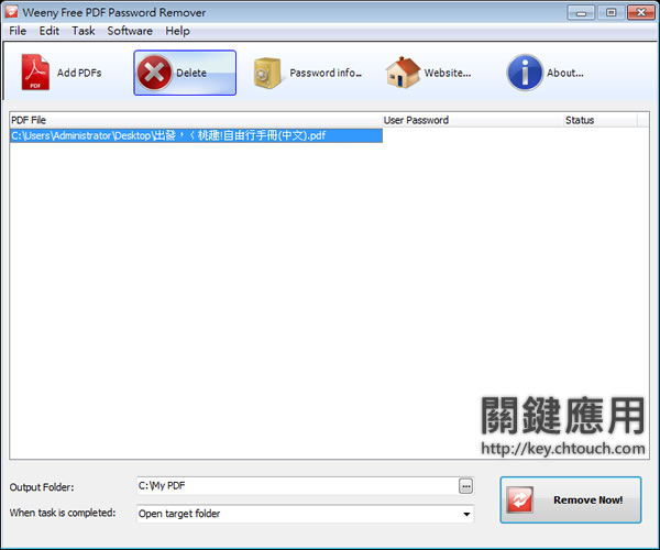 首頁電腦軟體檔案管理 Weeny Free PDF Password Remover 移除 PDF 文件的中的保全設置 PDF 文件可以設置保全項目,像是禁止複製文件內容、開啟時有密碼保護、禁止列印......等等的保護措施,想要解除 PDF 文件所設的限制,可以來使用 Weeny Free PDF Password Remover 這套免費軟體來移除這些保全措施。 🔔 不錯過任何精彩! 立即訂閱我們的 LINE 官方帳號 每次發佈新文章時,您將會第一時間收到本站文章連結通知,輕鬆掌握最新資訊! 使用 LINE 追蹤文章更新 §相關文章,還可以參閱:檔案好多重複怎麼辦?免費 dupeGuru 幫你一鍵清出電腦空間[ 免費使用 ]PDFgear 整合各種 PDF 工具,具格式轉換、編輯、合併或拆分等功能7-Zip 檔案壓縮與解壓縮免費軟體AmoK Exif Sorter 讓照片按拍照日期重新命名並自動分類的免費軟體PDF Unshare 限制 PDF 檔案的讀取有效日期 如何使用 Weeny Free PDF Password Remover? 1.安裝時,請選擇 Advance 來勾選安裝項目,避免同時安裝不相關的的應用程式。 2.開啟 Weeny Free PDF Password Remover 後,點擊[Add PDFs]來加入有保全限制的 PDF 文件,然後點擊[Remove Now!]即可。 Weeny Free PDF Password Remover版本:2.0語言:英文性質:免費適用:Windows官方網站:https://www.weenysoft.com/free-pdf-password-remover.html下載:按我下載