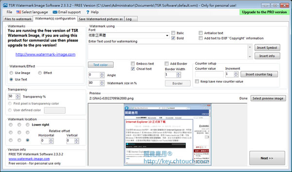 想要為自己所拍攝的照片或創作的圖片加入浮水印,可以來使用 TSR Watermark Image 這套個人使用的免費工具,提供文字輸入與圖片型態的浮水印加入方式,可自訂浮水印的透明度、位置...等等,並可即時預覽設定在圖片上的變化,讓加入浮水印的工作變得輕而易舉。
