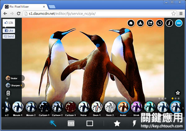 首頁瀏覽器擴充功能影像繪圖 Pixel Mixer 替圖片加入特效 - Chrome 瀏覽器擴充功能 想要替所拍攝的照片加入一些後製的效果,增加照片的可看性,可以來試試 Pix: Pixel Mixer 這套 Chrome 瀏覽器擴充功能,可替圖片加入濾鏡、效果或相框,操作簡便,無門檻。 🔔 不錯過任何精彩! 立即訂閱我們的 LINE 官方帳號 每次發佈新文章時,您將會第一時間收到本站文章連結通知,輕鬆掌握最新資訊! 使用 LINE 追蹤文章更新 §相關文章,還可以參閱:Pixzens 截圖美化工具:一鍵打造專業級視覺效果的瀏覽器擴充功能Image to Prompt Generator:輕鬆將圖片轉換為 AI 繪圖的文字描述,快速生成相似圖像BG Remaker 用 AI 移除背景、換背景,還可用文字描述由 AI 產生新背景Screenshot for Street View 移除「Google 街景」照片附加介面,看起來就像是自己拍攝的照片Magic Copy 用 Meta AI 直接在瀏覽器中刪除圖片背景且直接複製到剪貼簿(瀏覽器擴充功能) 如何安裝及使用 Pix: Pixel Mixer? 1.使用 Chrome 瀏覽器到達 Pix: Pixel Mixer 安裝網址後,按下[加到 Chrome]便會開始下載及安裝。 2.安裝完成後,在應用程式便會出現 Pix: Pixel Mixer 圖示按鈕。 3.開啟 Pix: Pixel Mixer 後,便可選擇圖片來源。 4.點擊圖片下方的濾鏡便可即時反應的圖片上,若覺得不滿意,可點擊垃圾桶圖示,刪除剛剛所加入的濾鏡。 5.切換最下方的工具列,可切換不同的工具。 完成後,可點擊右上方箭頭向下的圖示來儲存。 Pix: Pixel Mixer性質:免費官方網站:https://chrome.google.com/webstore/detail/pix-pixel-mixer/lbjiacdnbellpbhocabghholhnlboibg?hl=en