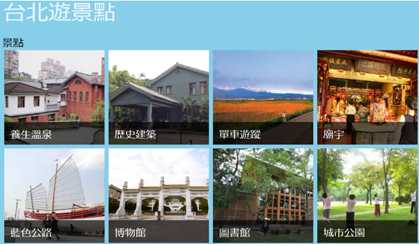 首頁移動設備生活資訊 台北遊景點﹝Windows 8 App﹞ 想到台北旅遊,不管是旅遊團還是自由行,想要玩得盡興,莫過於事前的旅遊動線規劃與搭配的食衣住行育樂等等,想要知道台北有哪些好玩的景點、如何利用公車或捷運、住哪裡、吃甚麼,這時候,可以來利用 Windows 8 免費應用程式「台北遊景點」來協助你,做好行前規劃,讓你玩得盡興。 🔔 不錯過任何精彩! 立即訂閱我們的 LINE 官方帳號 每次發佈新文章時,您將會第一時間收到本站文章連結通知,輕鬆掌握最新資訊! 使用 LINE 追蹤文章更新 §相關文章,還可以參閱:停車不再靠運氣!用 LINE「雞來客棧_GLike」機器人 3秒快速找車位Google Play 公布 2023 年度最佳遊戲及應用程式榜單「中央氣象局E-地震測報」APP即時掌握地震動態手機開啟 Google 搜尋「Pac-Man」就讓 Hello Kitty、小精靈、布丁狗及動漫人物以 3D 出現在現實環境中手機開啟 Google 搜尋動物名稱,就可利用 AR 技術將其融入到現實環境中 台北遊景點 介紹與安裝? 1.利用瀏覽器前往上述安裝網址,點擊[安裝]即可。 2.安裝完成,可以從動態磚來執行「台北遊景點」,開啟後,便是景點分類。 3.選擇感興趣分類來點擊,便會列出屬於該分類項的景點名稱與地址、交通、開放時間......等等資訊。 台北遊景點﹝Windows 8 App﹞適用:Windows RT官方網站:http://apps.microsoft.com/windows/zh-tw/app/d680fb59-6b71-48a7-b4f9-628129393ba0