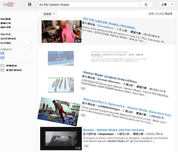 首頁線上工具未分類 YouTube 輸入關鍵字,網頁「哈林搖」搖給你看 流行是會退燒的,去年紅遍全世界的「騎馬舞」,熱度漸退,取而代之的是讓人摸不著頭緒的一種稱之為哈林搖(Harlem Shake)的舞步,其擴散的速度不輸韓國 PSY大叔的騎馬舞,若在 YouTube 上輸入關鍵字來搜尋哈林搖也有幾十萬筆的相關影片,現在 YouTube 也搭上「哈林搖」風,只要在搜尋框中填入「do the harlem shake」關鍵字,網頁便會開始「哈林搖」搖給你看。 🔔 不錯過任何精彩! 立即訂閱我們的 LINE 官方帳號 每次發佈新文章時,您將會第一時間收到本站文章連結通知,輕鬆掌握最新資訊! 使用 LINE 追蹤文章更新 §相關文章,還可以參閱:Google 親揭爆紅 AI 模型為何叫「Nano Banana」,答案出乎意料「半夜亂取的名字」爆紅全球!Google揭密 Nano Banana 命名背後的意外故事Luckydraw:最佳線上抽獎工具,適合尾牙、婚禮及各項活動抽獎How Old Do I Look:免費線上 AI 年齡分析工具,輕鬆測試你的看起來年齡Google 宣布 goo.gl 縮址服務即將停止 ,但已建立的永久有效 YouTube 輸入關鍵字,網頁「哈林搖」搖給你看 1.在 YouTube 搜尋框中輸入關鍵字「do the harlem shake」便會出現一段哈林搖的音樂,先是 YouTube Logo 開始搖,進而擴散到整個網頁。 2.「哈林搖」始祖。 3.台灣辣妹的哈林搖。