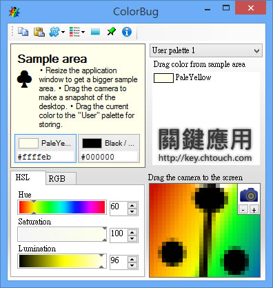 首頁電腦軟體生產力工具 ColorBug 螢幕取色工具,可產生漸層色 CSS 樣式表(免安裝) 美工的配色,佔有成品成功的關鍵要素,想要取得好的配色效果,除了經驗外,若能透過工具來協助,取色就更加輕鬆簡單,ColorBug 是一套螢幕的取色碼的免費應用工具,透過拖曳相機圖示,可取到螢幕任何位置的顏色,支援 HEX、RGB 及 Delphi、C++、Visual StudioIDE 等程式的色碼表,除此之外,ColorBug 還有項很特別的功能,就是能製作所選顏色的漸層色,並為該漸層色產生 CSS 樣式表,方便你應用到網頁中。 🔔 不錯過任何精彩! 立即訂閱我們的 LINE 官方帳號 每次發佈新文章時,您將會第一時間收到本站文章連結通知,輕鬆掌握最新資訊! 使用 LINE 追蹤文章更新 §相關文章,還可以參閱:AingDesk:一鍵安裝 Ollama AI 模型管理器,讓 LLaMA、DeepSeek 在本機電腦上運行Arc 瀏覽器正式登陸 Windows 11,開啟全新瀏覽體驗!Norton Secure Browser 使用 Chromium 核心的瀏覽器,有廣告封鎖和隱私保護功能BingGPT 桌面應用程式,讓你不用 Edge 也能用 Bing 聊天機器人SlippyClerk 數字、英文字母有序字串產生器 可自訂前後綴字詞 如何使用ColorBug? 1.下載免安裝版本並解壓縮,開啟 ColorBug 後,將相機圖式,使用滑鼠拖曳到螢幕要取色的位置來拍照,[+][-]可用來放大/縮小所拍照的相片,接下來便可用滴管來取色。 2.可點擊#圖示,來變更色碼表。 3.要產生漸層色,可點擊長方形的藍色圖示。 4.點擊[CSS export...]可產生支援IE、Chrome、FireFox 及 Opera 瀏覽器在內的 CSS 樣式表。 ColorBug版本:3.1語言:英文性質:免費適用:Windows官方網站:https://www.martinstoeckli.ch/colorbug/colorbug.html下載:按我前往官網下載