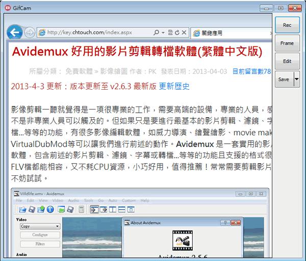 首頁電腦軟體螢幕工具 GifCam 將螢幕錄製成 GIF 動畫(免安裝) 想要將螢幕的操作步驟分享出去,不一定要錄製成影片格式,最簡單的方式,就是直接利用 GIF 的動畫圖片格式,GifCam 是一套相當簡單且好用的可將螢幕錄製成 GIF 圖片的免費應用軟體。 🔔 不錯過任何精彩! 立即訂閱我們的 LINE 官方帳號 每次發佈新文章時,您將會第一時間收到本站文章連結通知,輕鬆掌握最新資訊! 使用 LINE 追蹤文章更新 §相關文章,還可以參閱:Fliqlo 電腦翻頁式時鐘螢幕保護程式,免費下載使用ScreenToGif 將螢幕畫面錄影並存成 Gif 動畫檔Python 官方所提供的 IDLE 整合式開發環境PicPick 免費螢幕擷取軟體,內建編輯器和各項實用工具Pointofix 將螢幕變為電子白板,可直接在螢幕上畫箭頭、註記、標重點(繁體中文版) 如何使用GifCam ? 1.解壓縮下載的檔案,執行「GifCam.exe」便可開啟,無須安裝。開啟後,利用滑鼠拖曳視窗的四周邊框來調整錄製範圍,點擊[Rec]便可開始錄製,點擊[Stop]來停止錄製並儲存。 2.錄製範例。 GifCam版本:6.5語言:英文性質:免費適用:Windows官方網站:http://blog.bahraniapps.com/gifcam/下載:按我下載
