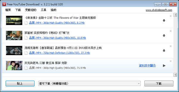 首頁電腦軟體上傳下載 Free YouTube Download - YouTube 影片下載工具 可以下載 YouTube 影片的免費工具有不少,不過也有很多未繼續開發維護,造成後續不能夠使用的問題。Free YouTube Download 是一套可用來下載 YouTube 影片的免費工具,其缺點不在於不能下載,而是在程式安裝過程中會綁上一堆不相關的應用程式以及當下載完 YouTube 影片要關閉 Free YouTube Download 時,會出現要升級的視窗,不過這些都可以在操作的動作上來避免。 🔔 不錯過任何精彩! 立即訂閱我們的 LINE 官方帳號 每次發佈新文章時,您將會第一時間收到本站文章連結通知,輕鬆掌握最新資訊! 使用 LINE 追蹤文章更新 §相關文章,還可以參閱:ArrowDL 全平台下載利器:輕鬆批量下載 YouTube、BT、FB與多站串流影片YouTubePlaylistDownloader 支援播放清單與頻道的 YouTube 影片下載工具,還能轉換格式Parabolic 讓 yt-dlp 更好用的免費影音下載工具,支援上千個網站的影音下載Hasleo Windows ISO Downloader 幫你從微軟網站下載原版 Windows ISO 檔XMusicDownloader 從音樂網站搜尋並下載歌曲的免費應用程式 如何使用 Free YouTube Download? 1.安裝過程請仔細勾選所要安裝的項目。 2.開啟 Free YouTube Download 後,將要下載的 YouTube 網址複製,貼到應用程式中。 3.點擊右下角的下載即可,完成下載要關閉應用程式時,會彈出要加快下載速度的升級視窗,直接關閉即可。 Free YouTube Download語言:英文性質:免費適用:Windows官方網站:http://www.dvdvideosoft.com/products/dvd/Free-YouTube-Download.htm下載:按我下載