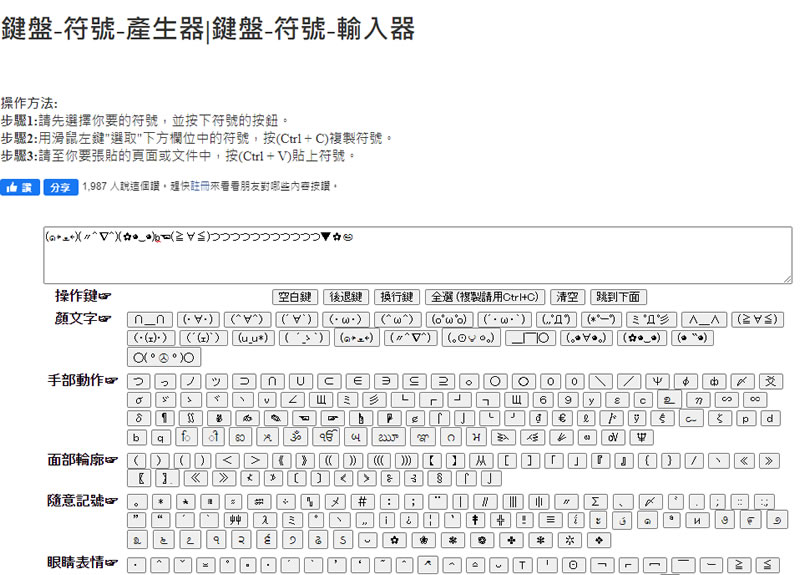 首頁線上工具生產力工具 鍵盤-符號-產生器 | 鍵盤-符號-輸入器 (✿◕‿◕)゚・:,。゚・:,。★゚・:,。゚・:,。☆ - ๑۩۞۩๑ ......以上的這些符號,若是要靠自己利用鍵盤敲出來,估計要花些時間,甚至花了時間,也不見得能打得出來,若是想要應用特殊符號,可以來參考「鍵盤-符號-產生器|鍵盤-符號-輸入器」這個網站,有很多不常見的符號,又能很方便的應用。 🔔 不錯過任何精彩! 立即訂閱我們的 LINE 官方帳號 每次發佈新文章時,您將會第一時間收到本站文章連結通知,輕鬆掌握最新資訊! 使用 LINE 追蹤文章更新 §相關文章,還可以參閱:ChatGPT 智慧購物功能登台!台灣用戶也能用 AI 做商品研究與比價2026學生專屬福利:從AI工具到雲端服務,10+款專業軟體免費/折扣全攻略ChatGPT 語氣微調功能上線!教你調整暖度、熱情度與表情符號ChatGPT 變身超級 App!OpenAI 推出應用程式目錄,免費版同樣可用ChatGPT 圖像功能大升級!GPT Image 1.5 五大實戰技巧一次公開 如何使用「鍵盤-符號-產生器|鍵盤-符號-輸入器」? 1.使用瀏覽器進入 鍵盤-符號-產生器|鍵盤-符號-輸入器網站後,便可看到密密麻麻的特殊符號。 2.點擊要使用的符號,將其新增到輸入框中,利用 Ctrl + C 來複製符號;Ctrl + V 來貼上符號。 *-.,.-*☆*-.,.-*★*-.,.-*☆*-.,.-*★*-.,.-*☆*-.,.-*゚・:,。*:..。o○☆♪:*:・・:*:・♪ 鍵盤-符號-產生器 | 鍵盤-符號-輸入器網站網址:https://symbol-input.ebookboxs.com/