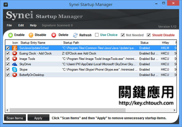 首頁電腦軟體系統應用 Synei Startup Manager 加入或移除隨 Windows 開機而自動執行的應用程式 Windows 開機時,若有額外的應用程式伴隨著一起啟用,難免拖慢開機時間,想要找出這些程序,可以來使用 Synei Startup Manager 這套免安裝的應用程式,除了會列出那些程式隨開機而自動執行外,若有想隨開機而自動執行的程式,亦可在這裡加入。 🔔 不錯過任何精彩! 立即訂閱我們的 LINE 官方帳號 每次發佈新文章時,您將會第一時間收到本站文章連結通知,輕鬆掌握最新資訊! 使用 LINE 追蹤文章更新 §相關文章,還可以參閱:CatLock:可鎖定鍵盤的 Windows 應用程式,防止寵物意外觸碰Zen Ad blocker 瀏覽器與應用程式均適用的廣告攔截器,免費且開放原始碼TimVer 一站式顯示 Windows 版本及電腦硬體相關訊息的工具「微軟電腦管家」內含開機啟動項目管理、儲存空間最佳化等免費工具 全方位提升電腦效能Windows Startup Timer 測量 Windows 從開機到完全啟動所需時間 如何使用 Synei Startup Manager? 1.解壓縮免安裝版本,執行「StartupManager.exe」便可開啟,無須安裝。開啟後,便會列出目前隨 Windows 開機程式而自動執行的應用程式,可去除勾選後,點擊[Apply]。 2.點擊 File > Add New Startup Entry 來開啟加入要隨 Windows 開機程式而自動執行的應用程式視窗。 Synei Startup Manager版本:1.12語言:英文性質:免費適用:Windows官方網站:http://www.synei.com/items/products/startup-manager下載:免安裝版 按我下載 | 安裝版 按我下載(1.6 MB)
