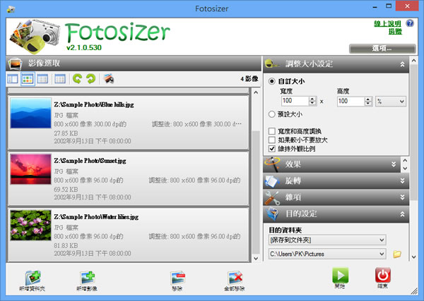 首頁電腦軟體影像繪圖 Fotosizer 批次更改圖片尺寸大小 現在的數位相片,解析度都越高,代表著相片內容越清晰,相對的檔案所占用的硬碟空間也越多,圖檔開啟的速度也會變慢,若是保存在自己電腦中,其實也還好,畢竟硬碟便宜,但若想要分享到出去,可能就需要考慮檔案的大小。想要變更圖片尺寸,降低占用硬碟空間,可以來使用 Fotosizer 這套可批次更改圖片尺寸大小的免費應用軟體。 🔔 不錯過任何精彩! 立即訂閱我們的 LINE 官方帳號 每次發佈新文章時,您將會第一時間收到本站文章連結通知,輕鬆掌握最新資訊! 使用 LINE 追蹤文章更新 §相關文章,還可以參閱:告別訂閱制!Canva 旗下 Affinity 永久免費,向量設計、影像處理、排版工具全面開放Pineapple Pictures 載入速度超快的相片檢視器(免安裝)PhotoResizerOK 可快速調整圖片尺寸的免費軟體ShortDoorNote 將輸入的文字快速轉成圖片Bzzt! Image Editor 圖片批次壓縮、轉檔及尺寸調整的免費工具 如何使用 Fotosizer? 1.下載 Free 版本並完成安裝,開啟時,會出現輸入產品密鑰的視窗,請點擊[繼續]。 2.進入主介面後,點擊最左上角的圖示按鈕或直接將圖片利用滑鼠拖拉到介面內來載入圖片,在調整大小設定的部分。 3.其他功能所做的效果。 最後,點擊[開始]來進行。 Fotosizer版本:2.09.0.548語言:英文性質:免費適用:Windows官方網站:https://www.fotosizer.com/下載:按我下載