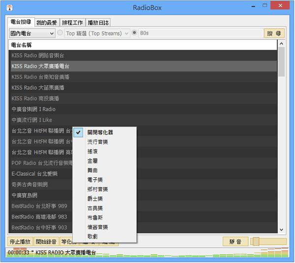 首頁電腦軟體影音視聽 My Radio Box 可錄音、預約播放時間的網路收音機 My Radio Box 是一套線上收音機軟體,您可以搜尋網路上已經存在的網路電台,不論是搖滾音樂、流行音樂、古典音樂.....,軟體都可以為您歸類尋找,只要您想的到的音樂類型,大致上都可以順利的搜尋,而且搜尋到的網路電台會依照熱門程度來排序,除了可搜尋全球的網路電台之外,您可以已將喜愛的網路電台加入到我的最愛中,下次啟動就不用重新尋找,使用上非常的方便,此外本軟體還內建了簡單的錄音功能,您可以一邊收聽,一邊錄製,還有預約收聽的功能,每個電台都可以指定您所要收聽的時間。(以上介紹,來自 官網) 🔔 不錯過任何精彩! 立即訂閱我們的 LINE 官方帳號 每次發佈新文章時,您將會第一時間收到本站文章連結通知,輕鬆掌握最新資訊! 使用 LINE 追蹤文章更新 §相關文章,還可以參閱:超實用免費軟體!DCP-o-matic 讓你的影片變成電影院 DCP 播放格式語音轉文字免費工具 AsrTools 輕鬆搞定字幕、筆記或歌詞整理免費的 PotPlayer 開始搭載 Whisper AI,讓你即時生成字幕與翻譯,外語影片輕鬆看SpleeterGUI:簡單易用的 AI 音軌分離免費開源工具如何使用 Microsoft Clipchamp 自動產生影片字幕? 如何使用 My Radio Box? 1.解壓縮下載的檔案,若對解7z 壓縮格式有問題,可參閱 7-ZIP 免費的壓縮及解壓縮軟體,使用教學(繁體中文版) ,解壓縮完成後,執行「RadioBox.exe」便可開啟,無須安裝。開啟後,點擊下拉框來選擇要收聽電台的種類,選擇好之後,點擊[搜尋],接下來,便會列出可收聽電台清單。 2.選中要播放的電台後,點擊[播放電台],便可開始收聽;可點擊[開始錄音]來啟用錄音。 3.要預約播放時,可在排程工作頁籤中來管理。 My Radio Box版本:1.40.30語言:繁體中文性質:免費適用:Windows官方網站:http://holanet.pixnet.net/blog/post/350066下載:按我下載 | 備用下載點