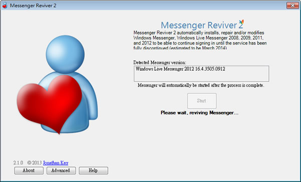 不管你電腦是否還存在 MSN,即便是以升級被移除了,現在只要你想繼續使用 MSN ,可以來使用 Messenger Reviver 2 這套免安裝,只有 400多 KB的工具,讓你免除被強迫升級,即便你已升級,MSN 已被移除,還可以安裝回 Windows Live Messenger(可選各種語言版本),讓你更有緩衝時間。