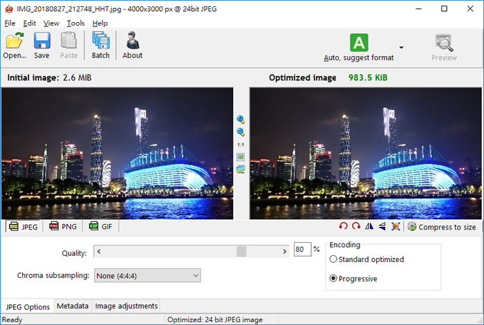 2.開啟後,若是要調整單張圖片,點擊 [ Open...],若是要調整多張圖片,可點擊 [ Batch],並在隨後出現的視窗中,找到要調整的相片後,點擊[ 開啟 ],經過最佳化後的相片,會出現在右手邊的欄位,並可與左邊原始圖片進行比較,用戶可以使用滑鼠拖動品質指數條進行調整圖片品質或直接輸入%框,其餘可參考下圖調整。