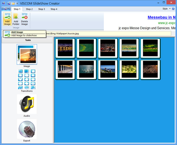 首頁電腦軟體影像繪圖 VISCOM Photo Slideshow Creator 利用影片格式來播放照片 VISCOM Photo Slideshow Creator 是一套免費的應用軟體,只要四個步驟,就可以輕鬆的建立出含有 3D在內的 70種轉場效果與背景音樂的照片幻燈片效果,且可以輸出包含 AVI、WMV、FLV、iPod、GIF、VCD、SVCD、DVD、AVCHD 在內的影像或圖片格式。 🔔 不錯過任何精彩! 立即訂閱我們的 LINE 官方帳號 每次發佈新文章時,您將會第一時間收到本站文章連結通知,輕鬆掌握最新資訊! 使用 LINE 追蹤文章更新 §相關文章,還可以參閱:告別訂閱制!Canva 旗下 Affinity 永久免費,向量設計、影像處理、排版工具全面開放Pineapple Pictures 載入速度超快的相片檢視器(免安裝)PhotoResizerOK 可快速調整圖片尺寸的免費軟體ShortDoorNote 將輸入的文字快速轉成圖片Bzzt! Image Editor 圖片批次壓縮、轉檔及尺寸調整的免費工具 如何使用 VISCOM Photo Slideshow Creator? 1.完成安裝,開啟 VISCOM Photo Slideshow Creator 後,點擊[Add Image]來選擇單張圖片或是點擊[Add Folder]來選擇資料夾內的所有圖片。 2.步驟 2是加入圖片照片展示時間與轉場效果。 3.步驟 3可加入背景音樂。 4.步驟 4可讓我們選擇輸出格式。 VISCOM Photo Slideshow Creator版本:2.08語言:英文性質:免費適用:Windows官方網站:http://www.viscomstore.com/viewproduct/20632-VISCOM-Photo-Slideshow-Creator.html下載:按我下載