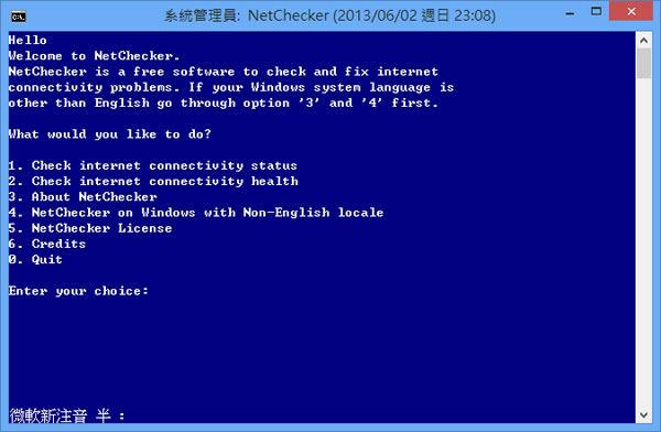 首頁電腦軟體網路應用 NetChecker 診斷網路連接問題 網路有問題無法連接,如果知道問題,可能還好解決,要是不知道可能就要檢查很多的設備,NetChecker 是一套很簡便的網路診斷工具,利用「命令提示字元」的操作方式,除了可以幫你檢查目前網路連接問題,針對網站的部分也可能做一個連接品質的報告。 🔔 不錯過任何精彩! 立即訂閱我們的 LINE 官方帳號 每次發佈新文章時,您將會第一時間收到本站文章連結通知,輕鬆掌握最新資訊! 使用 LINE 追蹤文章更新 §相關文章,還可以參閱:Bright VPN 提供覆蓋全球60多個位置的免費 VPN服務WhoisThisDomain 網域名稱註冊資料免費查詢工具PingInfoView 可自訂時間 PING 自訂的 IP 或網域並發出通知Wireless Network Watcher 找出有哪些裝置正在連你的無線網路IPNetInfo IP 資訊查詢工具 如何使用 NetChecker? 1.完成安裝,開啟 NetChecker 後,輸入所要的選項:1:診斷網路狀態;2:檢查網站狀態 2.針對 2選項的診斷,再輸入網址的時候,請不要輸入 http://。 NetChecker語言:英文性質:免費適用:Windows官方網站:http://www.netcheckersoftware.blogspot.in/下載:按我下載