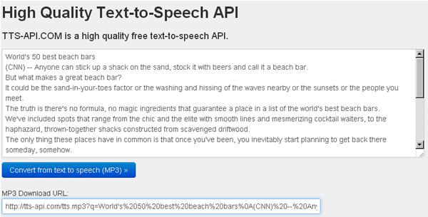 首頁線上工具翻譯辨識 TTS-API 文字轉語音線上服務(英文),還可下載 MP3 檔案 想要將英文文章轉成會朗讀的語音,現在你可以透過 TTS-API 這個文字轉語音的線上免費服務,就可以輕易辦到,發音相當自然,甚至你還可以將朗讀的語音檔(MP3 格式)下載回自己的電腦,反覆的播放聆聽,對練習英文聽力應該會有很大的幫助。 🔔 不錯過任何精彩! 立即訂閱我們的 LINE 官方帳號 每次發佈新文章時,您將會第一時間收到本站文章連結通知,輕鬆掌握最新資訊! 使用 LINE 追蹤文章更新 §相關文章,還可以參閱:ScanQR 免費線上二維碼辨識工具,輕鬆解讀 QR Code 內容TTSMaker 線上文字轉語音免費工具,中文也沒問題Whisper JAX 免費語音轉文字工具,適用 Microphone、Audio File 及 YouTube 影片OLOCR 識別圖片或 PDF 內容文字,支援多國語言GPT-Translator 旅行翻譯神器,支援多國語言和語音輸入與輸出 如何使用 TTS-API? 1.使用瀏覽器進入 TTS-API 網站,將複製的英文文章,貼到輸入框內。 2.接下來,點擊[Convert from text to speech (MP3) »]便會開始朗讀,同時出現該語音檔案的下載網址。 TTS-API網站網址:http://tts-api.com/