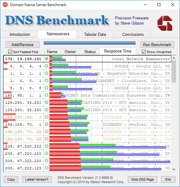 2.接下來點擊[Run Benchmark]來進行測試,預設是回應速度越快地排在越上面,綠色長條表示 DNS 的回應時間,藍色長條表示所查詢的資訊不存在該 DNS 中,須往上向更高層級 DNS 查詢的回應時間,紅色長條則是 .com域名的查詢時間,可看出來最近加入的1.1.1.1、1.0.0.1 速度確實不慢,至於 9.9.9.9 的速度並不快。