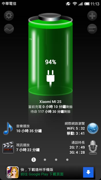 首頁移動設備系統應用 「電池高清顯示器」簡潔、美觀的電池顯示器 覺得手機上狀態欄的電池容量顯示太小,看不清楚,可以來安裝「電池高清顯示器」這個 Android 應用程式,介面簡潔、美觀,即刻知道電池還剩餘多少小時,並預估聽音樂、電話通話、待機、使用使電筒、拍照......等操作動作可用時間,相當清楚,一目瞭然。 🔔 不錯過任何精彩! 立即訂閱我們的 LINE 官方帳號 每次發佈新文章時,您將會第一時間收到本站文章連結通知,輕鬆掌握最新資訊! 使用 LINE 追蹤文章更新 §相關文章,還可以參閱:「Android」如何關閉或開啟「智慧助手」?[ Android ]如何更改預設的瀏覽器?如何使用 Android 系統中內建的 VPN 功能進行 VPN 連線?如何查詢 Android 系統上的 Edge、Chrome 瀏覽器是 32還是 64位元?如何開啟 Android 系統內隱藏的「開發人員選項」功能,方便手機調校? 如何使用 「電池高清顯示器」? 1.完成安裝,開啟電池高清顯示器,便會立即顯示目前電量,並列出所要執行的動作可用時間。 2.撥動分頁,可看詳細內容。 電池高清顯示器APP性質:免費安裝網址:Android 按我前往