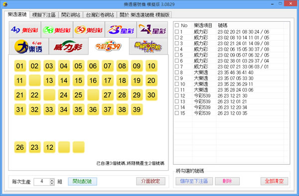 首頁電腦軟體生活資訊 樂透選號機 - 大樂透、樂透彩、今彩 539、樂線 9宮格號碼產生器(免安裝) 發財夢人人有,想要發財,當然還是要循正當管道,透過彩券,也是正當管道之一,若中,那可是一夜致富,如何挑選號碼,可以利用「樂透選號機」這個免安裝又免費的應用程式來協助,支援的彩券種類有大樂透、樂透彩、今彩 539、樂線 9宮格、49樂合彩、38樂合彩、39樂合彩、3星彩、4星彩等,其特色在於可加入自選的號碼,其餘號碼可透過模擬自動產生。 🔔 不錯過任何精彩! 立即訂閱我們的 LINE 官方帳號 每次發佈新文章時,您將會第一時間收到本站文章連結通知,輕鬆掌握最新資訊! 使用 LINE 追蹤文章更新 §相關文章,還可以參閱:Opal 可自由混搭雨聲、風聲、交通聲...等 17種環境音播放器地牛Wake Up! - 電腦版的地震速報免安裝「姓名吉凶分析」輸入姓名就幫你分析吉凶Complete Anatomy 使用 3D 了解人類身體結構RandomNames 英文名字產生器(免安裝) 如何使用樂透選號機? 1.解壓縮所下載的檔案並執行「樂透彩選號機.exe」便可開啟,無須安裝。可先自選號碼並可在左下方處點選一次要產生幾組號碼後,點擊[開始配號],其結果會產生在右側格線中。 2.所產生的號碼勾選後,可點擊[儲存至下注區]來計算總投注金額,並模擬對獎。 樂透選號機版本:3.0829語言:中文性質:免費適用:Windows官方網站:http://www.dotblogs.com.tw/ichying/archive/2013/01/18/87508.aspx下載:按我下載