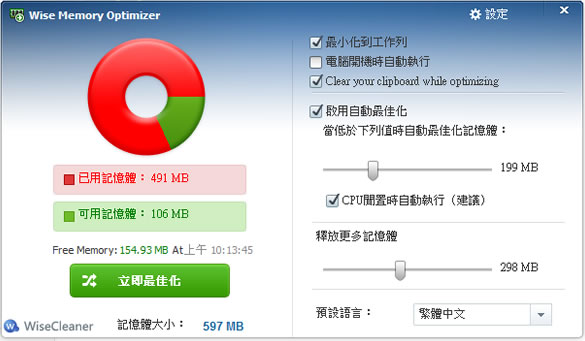 首頁電腦軟體系統應用 Wise Memory Optimizer 記憶體最佳化免費工具 當電腦同時所執行的應用程式越多時,總會覺得效能不好,這時候,可以來使用 Wise Memory Optimizer 這套可以幫電腦記憶體最佳化的免費工具,他能夠以圖表的方式即時顯示目前已使用與剩餘的記憶體空間,並自動將記憶體最佳化。 🔔 不錯過任何精彩! 立即訂閱我們的 LINE 官方帳號 每次發佈新文章時,您將會第一時間收到本站文章連結通知,輕鬆掌握最新資訊! 使用 LINE 追蹤文章更新 §相關文章,還可以參閱:CatLock:可鎖定鍵盤的 Windows 應用程式,防止寵物意外觸碰Zen Ad blocker 瀏覽器與應用程式均適用的廣告攔截器,免費且開放原始碼TimVer 一站式顯示 Windows 版本及電腦硬體相關訊息的工具「微軟電腦管家」內含開機啟動項目管理、儲存空間最佳化等免費工具 全方位提升電腦效能Windows Startup Timer 測量 Windows 從開機到完全啟動所需時間 如何使用 Wise Memory Optimizer ? 1.解壓縮下載的檔案並執行「WiseMemoryOptimzer.exe」便可開啟應用程式,無須安裝。開啟後,會即時顯示目前記憶體使用情形。 2.點擊右上方的[Settings]可開啟設定視窗,設定介面語言及相關參數。 Wise Memory Optimizer版本:4.1.7語言:繁體中文(多國語言)性質:免費適用:Windows官方網站:https://www.wisecleaner.com/wise-memory-optimizer.html下載:安裝版 按我下載
