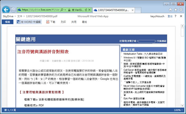 首頁線上工具檔案管理 透過 OneDrive(SkyDrive) 將 PDF 檔轉成 Word 檔 有很多的工具可將文件類型的檔案轉成 PDF 檔案,其中文件、字形保留的最好的莫過於使用虛擬印表機,但是想反過來想要將 PDF 文件轉成微軟 Office Word 檔案,工具卻不多,且文件中的格式、字形大都無法保留,尤其是中文的內容。現在想要將 PDF 轉 Word,可以來使用微軟 SkyDrive 雲端硬碟來協助,透過 Word 的原創廠商來轉換,雖說不能百分百,但具有一定的品質,且除了轉換,還可以直接在線上透過 Word 直接編輯。 🔔 不錯過任何精彩! 立即訂閱我們的 LINE 官方帳號 每次發佈新文章時,您將會第一時間收到本站文章連結通知,輕鬆掌握最新資訊! 使用 LINE 追蹤文章更新 §相關文章,還可以參閱:VERT:開源本地端檔案格式轉換器,隱私優先的免費瀏覽器轉檔工具PageSplitty 線上 PDF 分割轉 JPG、PNG、WebP 圖工具,支援 5GB 大小的大檔案PixDuplicate:免上傳快速找出並刪除重複照片的免費線上工具Adapter:全方位影片、音檔及圖片格式轉換免費軟體,支援影片轉音檔與圖片,音檔及圖片格式互轉TextCompare 線上比較 Excel、PDF 及圖片,快速找出檔案不同之處 如何使用 透過 SkyDrive 將 PDF 檔轉成 Word 檔? 1.登入自己的 SkyDrive 帳號,並上傳要轉換的 PDF 檔案。 2.開啟要轉換的 PDF 檔案並點擊[在 WORD 中編輯]。 3.接下來便會開始轉換程序。 4.完成轉換,便可用 Word 來開啟並編輯。 編輯完成後,便可利用同步機制或下載回自己電腦內。 SkyDrive網站網址:https://skydrive.live.com/