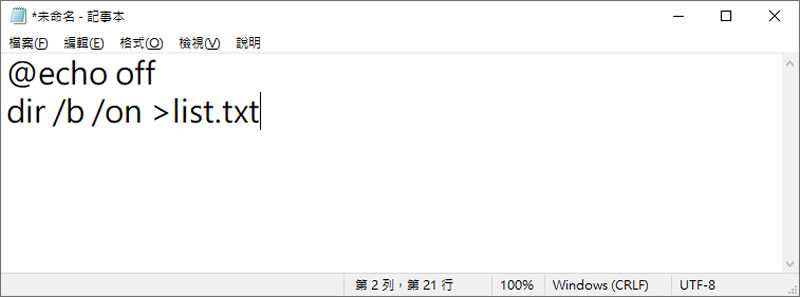 首頁操作技巧Windows [ Windows ]如何快速取出資料夾內所有檔案的名稱? 想要取得資料夾內所有檔案名稱包含副檔名,如果檔案不多還能用複製的方法一筆一筆的貼上,若是多了,那可能就不太適合,可以利用像是 Directory File List (免安裝) 免費軟體來製作,另外一種方法可以自製一個 bat 檔,放在要取得檔案名稱的資料夾內,執行後,便可產生一個內容為該資料夾內所有檔案名稱的文字檔。 🔔 不錯過任何精彩! 立即訂閱我們的 LINE 官方帳號 每次發佈新文章時,您將會第一時間收到本站文章連結通知,輕鬆掌握最新資訊! 使用 LINE 追蹤文章更新 §相關文章,還可以參閱:你的 Windows 筆電是真睡還是裝睡?一個設定終結背包發熱耗電學起來!微軟親授 10 個提升 Windows PC 效能的技巧如何升級 Windows 11 25H2?最新版本功能亮點與完整更新步驟Windows 工作列時鐘顯示秒數:真的會影響電池續航力嗎?LTT Labs 完整實測解析Windows 快速取出資料夾檔案名稱清單!內建功能輕鬆搞定,不用額外軟體 快速複製資料夾內所有檔案的名稱? 1.開啟記事本,將下列文字複製後貼到該記事本內。 @echo off dir /b /on >list.txt 2檔案名稱可自取,但副檔名需儲存為 bat,完成後將該檔案置於要產生檔案名稱的資料夾內。 3.滑鼠雙擊該 bat 檔案,便會執行,且會產生一個 list.txt 檔案。 4.開啟該 list.txt 辨識該資料夾內所有檔案名稱。