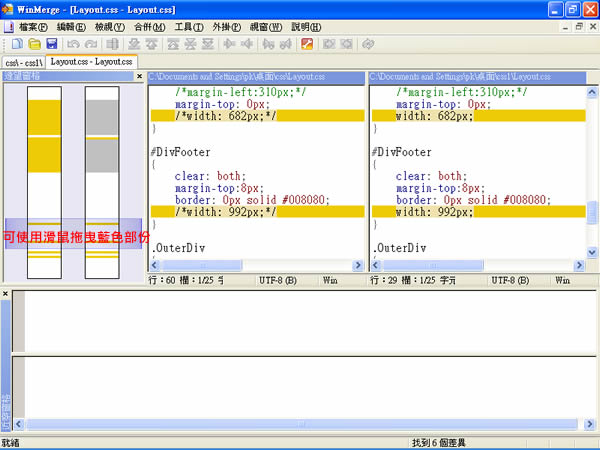 4.接下來便會出現文件內容比較結果,並以顏色標出不同處,若要查看不同處,可以使用滑鼠拖曳移動藍色透明框來查看,此時右邊的文件位置也會跟著移動,方便找出不同之處。