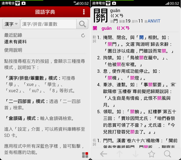 首頁移動設備學習資源 「國語字典」可以離線使用的國語字典 讀小學的時候,家裡都會有一本國語字典,可以按部首、注音、筆畫來查詢,若是現在有需要查詢,可以利用「國語字典」這個 Android 應用程式,利用注音、漢語拼音、筆畫數來進行查詢。 🔔 不錯過任何精彩! 立即訂閱我們的 LINE 官方帳號 每次發佈新文章時,您將會第一時間收到本站文章連結通知,輕鬆掌握最新資訊! 使用 LINE 追蹤文章更新 §相關文章,還可以參閱:「國中英語補救教學」國中七、八、九年級課文語音+字詞、句型與聽力練習+1200 單字[ Android ]聽憲法、行政 - 讓你用聽的就能背法條PhotoMath 透過照相機輸入數學算式,並列出解題步驟﹝Android﹞MyScript Calculator 可用手寫算式的計算機iStair+ 訓練大腦與手指反應力的遊戲(全力階段+) 如何使用「國語字典」? 1.開啟「國語字典」後,可使用注音、拼音或筆畫數來輸入要查詢的國字。 2.點擊國語字典旁的 3個垂直點圖示按鈕,可以開啟設定頁面來調整字體大小或是將資料庫移到 SD Card。 國語字典APP性質:免費官方網站:https://play.google.com/store/apps/details?id=org.hisand.zidian.zht安裝網址:若在 Google Play 已下架,可以改前往:Android 按我前往