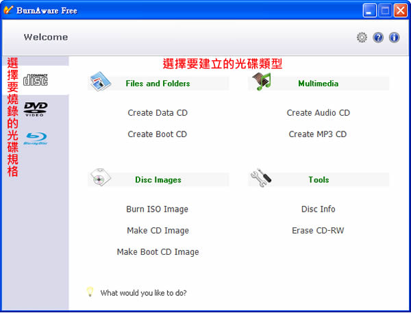 1.安裝好之後,開啟 BurnAware Free 主介面,可以在左邊頁籤選擇所要燒錄的光碟片類型,如CD、DVD或藍光光碟片,右邊視窗中會列出目前可執行的光碟燒錄方式,如建立資料光碟、建立音樂CD、建立ISO映像檔、建立可開機光碟...等,直接點選執行即可。