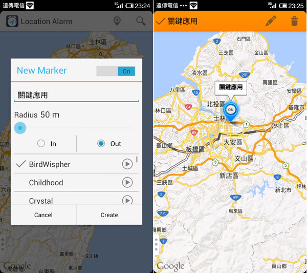 首頁移動設備生活資訊 「Location Alarm 定位報警」設定達到或離開某個位置的範圍時,自動發出聲音警示 上班、下班、出差、旅行若是搭乘大眾運輸工具,像是火車、公車,難免會睡著而錯過下站的站台,若是能事先設定到達位置的距離範圍,就能事先透過手機發出聲響來通知自己,先行準備,避免一到站手忙腳亂,急著下車,而將隨身物品遺留在車上。「定位報警」是一個 Android 應用程式,可以利用 Google 地圖自訂目標位置並設定接近或離開該位置還有多少距離,發出警示音響來提醒自己。 🔔 不錯過任何精彩! 立即訂閱我們的 LINE 官方帳號 每次發佈新文章時,您將會第一時間收到本站文章連結通知,輕鬆掌握最新資訊! 使用 LINE 追蹤文章更新 §相關文章,還可以參閱:停車不再靠運氣!用 LINE「雞來客棧_GLike」機器人 3秒快速找車位Google Play 公布 2023 年度最佳遊戲及應用程式榜單「中央氣象局E-地震測報」APP即時掌握地震動態手機開啟 Google 搜尋「Pac-Man」就讓 Hello Kitty、小精靈、布丁狗及動漫人物以 3D 出現在現實環境中手機開啟 Google 搜尋動物名稱,就可利用 AR 技術將其融入到現實環境中 如何使用 「定位報警」? 1.完成安裝,開啟「定位報警」後,會出現操作提示,點擊[Finish tour]進入主程式。 2.接下來可以點擊功能表上的[+]圖示後,再點擊地圖來設定目的地與範圍,並選擇進入(in)或離開(out)範圍。 定位報警APP性質:免費官方網站:https://play.google.com/store/apps/details?id=com.milwus.location_alarm安裝網址:若在 Google Play 已下架,可以改前往:Android 按我前往