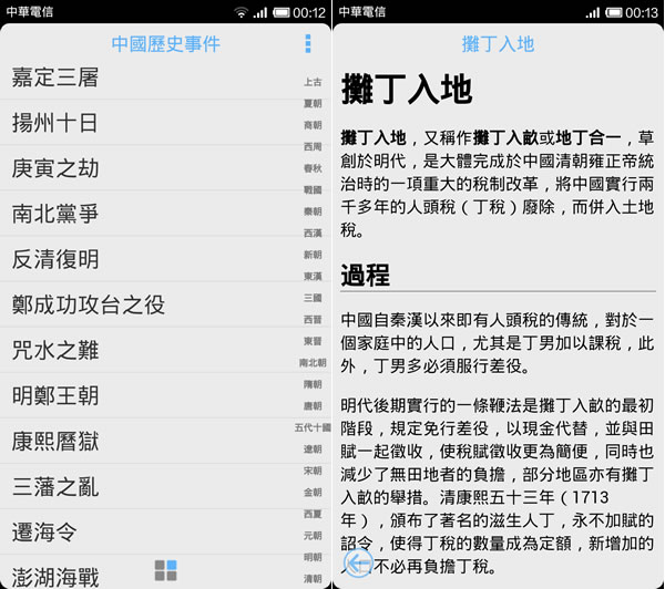 首頁移動設備學習資源 中國歷史事件 - Android 應用程式 很多人對中國歷朝歷代的歷史很有興趣,但如要從頭讀起,也需要有耐心與時間,如何快速了解中國歷史事件,可以來安裝「中國歷史事件」這個 Android 應用程式,該應用程式整理出從傳說時代到清朝時期,每個朝代的所發生的重大歷史事件,並做一簡單的勾勒,道出事件之來源,從而明瞭事件始末。 🔔 不錯過任何精彩! 立即訂閱我們的 LINE 官方帳號 每次發佈新文章時,您將會第一時間收到本站文章連結通知,輕鬆掌握最新資訊! 使用 LINE 追蹤文章更新 §相關文章,還可以參閱:「國中英語補救教學」國中七、八、九年級課文語音+字詞、句型與聽力練習+1200 單字[ Android ]聽憲法、行政 - 讓你用聽的就能背法條PhotoMath 透過照相機輸入數學算式,並列出解題步驟﹝Android﹞MyScript Calculator 可用手寫算式的計算機iStair+ 訓練大腦與手指反應力的遊戲(全力階段+) 如何使用中國歷史事件? 完成安裝,開啟「中國歷史事件」後,便可滑動到有興趣了解的朝代來看看有那些著名的事件。 中國歷史事件APP性質:免費官方網站:https://play.google.com/store/apps/details?id=org.hisand.historyevents.zht安裝網址:若在 Google Play 已下架,可以在這裡試試!