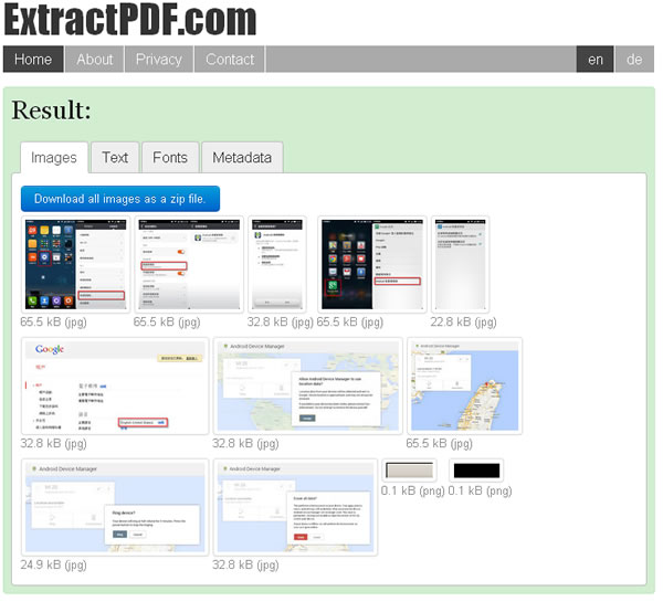 首頁線上工具生產力工具 ExtractPDF.com 線上取出 PDF 檔案中的圖片、文字、字形及 Metadata(支援中文) 想要針對沒有原始檔案的 PDF 文件做一些後續的應用,例如取出文件中的圖片、文字、字形或是中記性的描述資料(Metadata)時,可以來試試 ExtractPDF.com 這個免費的網頁應用,該服務將 PDF 文件解析成 Images、Text、Fonts、Metadata 等四項,且對中文字的部分支援良好,讓你方便取用 PDF 文件中的資源,免除需要安裝只能解析圖片或文字單一功能的應用軟體。 🔔 不錯過任何精彩! 立即訂閱我們的 LINE 官方帳號 每次發佈新文章時,您將會第一時間收到本站文章連結通知,輕鬆掌握最新資訊! 使用 LINE 追蹤文章更新 §相關文章,還可以參閱:OpenAI 在 ChatGPT 中測試廣告|哪些帳戶受影響、廣告運作原則一次看在蝦皮當賣家,商品如何定價?手續費、免運、稅金怎麼算?蝦皮手續費計算機幫你全搞定!Google AI Plus 降到 260 元對決 ChatGPT Go!誰的功能更值得訂閱?ChatGPT Go 月付 290 元值得嗎?免費版、Plus 完整比較用 AI 做出的電影,YouTube 就看得到!一起來欣賞這部贏得百萬美元的突尼西亞短片《Lily》 如何使用 ExtractPDF.com 來解析 PDF 文件? 1.利用瀏覽器到達 ExtractPDF.com 網站,若是要解析電腦中的 PDF 檔案,可以點擊[選擇檔案],若檔案是在網路上,也可以在 or enter an URL 中輸入檔案的網址後,點擊[Send File]。 2.上傳並處裡完成後,便會將 PDF 文件解析成 Images、Text、Fonts、Metadata 等四項,讓你方便取用(Fonts 沒有資料)。 ExtractPDF.com網站網址:https://www.extractpdf.com/