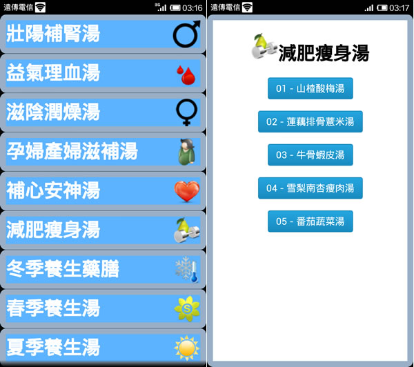 首頁移動設備生活資訊 「中式湯水食譜」- 讓喝湯也能養身 姑且不論「湯」應該是飯前還是飯後來喝最能養身,想要喝好湯又能養身,可以來安裝「中式湯水食譜」這個 Android 應用程式,該 APP 將「湯」依功效歸類出像是壯陽補腎湯、滋陰潤燥湯、減肥瘦身湯、養身藥膳......等,每類列出其中湯品,並將每種湯品的所使用的原料與詳細作法及其功效詳細列出以供參考,讓你喝湯的時候,更能兼顧身體健康。 🔔 不錯過任何精彩! 立即訂閱我們的 LINE 官方帳號 每次發佈新文章時,您將會第一時間收到本站文章連結通知,輕鬆掌握最新資訊! 使用 LINE 追蹤文章更新 §相關文章,還可以參閱:停車不再靠運氣!用 LINE「雞來客棧_GLike」機器人 3秒快速找車位Google Play 公布 2023 年度最佳遊戲及應用程式榜單「中央氣象局E-地震測報」APP即時掌握地震動態手機開啟 Google 搜尋「Pac-Man」就讓 Hello Kitty、小精靈、布丁狗及動漫人物以 3D 出現在現實環境中手機開啟 Google 搜尋動物名稱,就可利用 AR 技術將其融入到現實環境中 如何使用 中式湯水食譜? 可根據功效大類來尋找所要湯品;點擊湯品便可進入詳細作法。 中式湯水食譜APP性質:免費官方網站:https://play.google.com/store/apps/details?id=theChinese.DeliciousSoups