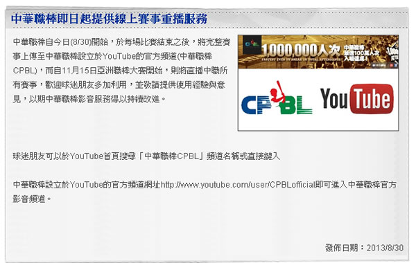 首頁線上工具生活資訊 在中華職棒 CPBL 官方 Youtube 頻道觀看完整比賽影片,並自 2013-11-15 起提供線上直播 自經典賽後,買票進場看中華職棒的球迷越來越多,若是沒時間進場看球賽,也無法看轉播,可以來參考中華職棒於 2013-8-30 發布消息,將在每場比賽結束之後,會將完整賽事上傳至中華職棒設立於 YouTube 的官方頻道(中華職棒CPBL),而自 2013年 11月 15日亞洲職棒大賽開始,則將直播中職所有賽事。 🔔 不錯過任何精彩! 立即訂閱我們的 LINE 官方帳號 每次發佈新文章時,您將會第一時間收到本站文章連結通知,輕鬆掌握最新資訊! 使用 LINE 追蹤文章更新 §相關文章,還可以參閱:小心!LINE 帳號新型盜用手法:千萬別綁定陌生人的 Apple 或 Google 帳號電動車電池到底能用多久?Geotab 追蹤研究 22,700 輛車數據揭密LINE GO 首頁大改版!3 大功能升級讓叫車租車更順暢怎麼吃才健康?美國官方膳食指南:優先蛋白質、全脂乳製品,強調吃真食物AI 醫療新時代:OpenAI 推出 ChatGPT Health,你的專屬健康管理專家 中華職棒 1.中華職棒 CPBL 官方新聞。 2.有 720p 的畫質。 中華職棒設立於 YouTube 的官方頻道網站網址:http://www.youtube.com/user/CPBLofficial相關網址:官方新聞