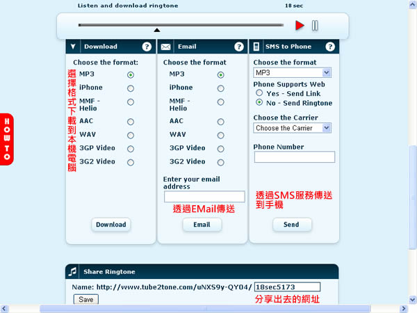 首頁線上工具影音視聽 tube2tone 使用線上 Youtube 影音搜尋、轉檔建立手機鈴聲! tube2tone 是一個提供 Youtube 影音網站搜尋、並可轉檔成手機鈴聲的網站服務,tube2tone 提供靈活的可自由選擇錄製40秒的區間,可以擷取自己想要的部份來當作手機鈴聲,免去下載後還要再進行編輯的動作,而在其轉檔的部分,tube2tone 提供可轉檔的格式包含 MP3、iPhone 、MMF - Helio、AAC、WAV、3GP Video 及 3G2 Video 等,相當實用。 🔔 不錯過任何精彩! 立即訂閱我們的 LINE 官方帳號 每次發佈新文章時,您將會第一時間收到本站文章連結通知,輕鬆掌握最新資訊! 使用 LINE 追蹤文章更新 §相關文章,還可以參閱:sound&go 耳機測試工具:免安裝測左右聲道、頻率響應Veo 3.1「材料轉影片」功能升級:支援直式影片與 4K 畫質來了!OpenAI Sora Android 版上線 Google Play,台灣用戶同步開放Google 親授 Veo 3.1 用電影語言與音效設計打造完美 AI 影片Sora Watermarker:一鍵為影片加上 OpenAI Sora 浮水印 如何使用 tube2tone 所提供的服務? 1.進入 tube2tone 網站後,若是已知的 Youtube 影音網址,可直接貼在 Search or enter video URL 的輸入框中後,點擊[Search],若不知道可輸入關鍵字搜尋﹝測試結果好像不支援中文﹞。 2.點擊[播放],並在想要錄製的影片位置,點擊[錄製]就是那顆紅色圓點,到達想停止的片段,點擊[停止錄製]或40秒後自動停止。 3.錄製好之後,點擊[Create],隨後會出現 「I agree to the terms and conditions」必須同意的使用條款,點擊[I agree]。 4.接下來就會出現如何處理剛剛錄製的手機鈴聲或3GP影片檔,tube2tone 提供可下載到本機、透過EMail傳送或使用SMS直接傳到手機,若還想分享給好朋友,可複製下方的網址給好友一起使用。 tube2tone網站網址:http://www.tube2tone.com/