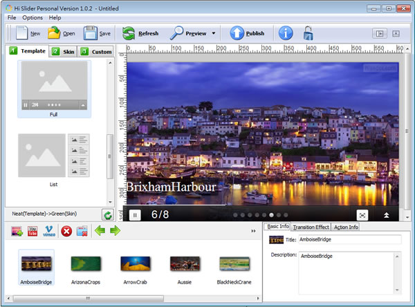 3.點擊[+]來加入要展示的相片,並適時調整 Slider options的參數,在右下欄的 Basic Info 頁籤,可加入相片的說明(展示時會出現),Transition Effect 可調整相片轉場效果。
