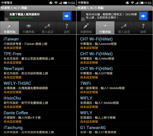 首頁移動設備生產力工具 快速登入 Wi-Fi 熱點 - 免除每次要開啟瀏覽器、輸入帳號等繁瑣步驟與複雜的帳號管理 台灣有很多免費的 Wi-Fi 熱點可供使用,像是 iTaiwan 無線上網、TPE-Free 臺北公眾區免費無線上網、NewTaipei 新北市政府無線上網、iHsinChu 新竹市政府無線上網、iTaichung 台中市政府無線上網、WIFLY-THSRC 台灣高鐵無線上網...等,當然也有很多事要付費的,要使用這些免費、付費的 Wi-Fi 熱點,其步驟大概都脫離不了開啟瀏覽器,接下來輸入帳號、密碼,才能開始使用,若覺得每次都要重複該步驟很麻煩,可以來使用「快速登入 Wi-Fi 熱點」這個 Android 應用程式,幫你做好帳號、密碼管理,當進入這些免費/付費的 Wi-Fi 熱點,便能自動登入,免除繁瑣步驟。 🔔 不錯過任何精彩! 立即訂閱我們的 LINE 官方帳號 每次發佈新文章時,您將會第一時間收到本站文章連結通知,輕鬆掌握最新資訊! 使用 LINE 追蹤文章更新 §相關文章,還可以參閱:Phone On Web 免任何安裝就可以在瀏覽器內使用滑鼠與鍵盤操作手機的各項功能「Edge」如何在手機內捲動瀏覽畫面做長截圖?如何使用 Android 內建鏡頭將文件掃描成 PDF 檔案?1Timer 有語音報時的 App如何在 Android 上使用 Chrome 擷取完整的網頁截圖? 如何使用 快速登入 Wi-Fi 熱點? 1.開啟「快速登入 Wi-Fi 熱點」後,可以看到內建免費/付費的 Wi-Fi 熱點提供者,點擊要使用的 Wi-Fi 熱點。 2.接下來便可輸入帳號、密碼。 3.可設定要連接的時機。 快速登入 Wi-Fi 熱點APP性質:免費官方網站:https://play.google.com/store/apps/details?id=TW.App.Che
