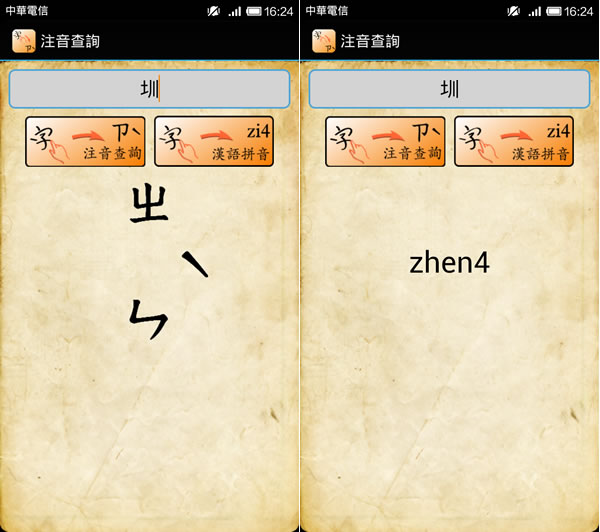 首頁移動設備學習資源 注音查詢 - 查詢字的注音符號與漢語拼音 對於不會讀出的中文字,想要知道其注音符號或漢語拼音是如何拼寫,可以來安裝「注音查詢」這個 Android 應用程式,透過手寫的方式將字輸入,便可知道其注音符號與漢語拼音。 🔔 不錯過任何精彩! 立即訂閱我們的 LINE 官方帳號 每次發佈新文章時,您將會第一時間收到本站文章連結通知,輕鬆掌握最新資訊! 使用 LINE 追蹤文章更新 §相關文章,還可以參閱:「國中英語補救教學」國中七、八、九年級課文語音+字詞、句型與聽力練習+1200 單字[ Android ]聽憲法、行政 - 讓你用聽的就能背法條PhotoMath 透過照相機輸入數學算式,並列出解題步驟﹝Android﹞MyScript Calculator 可用手寫算式的計算機iStair+ 訓練大腦與手指反應力的遊戲(全力階段+) 如何使用注音查詢? 1.開啟「注音查詢」利用手寫的方式將中文字輸入。 2.點擊[注音查詢]或[漢語拼音]即可取得結果。 注音查詢APP性質:免費官方網站:https://play.google.com/store/apps/details?id=lincyu.pinyin&feature=search_result#?t=W251bGwsMSwxLDEsImxpbmN5dS5waW55aW4iXQ..