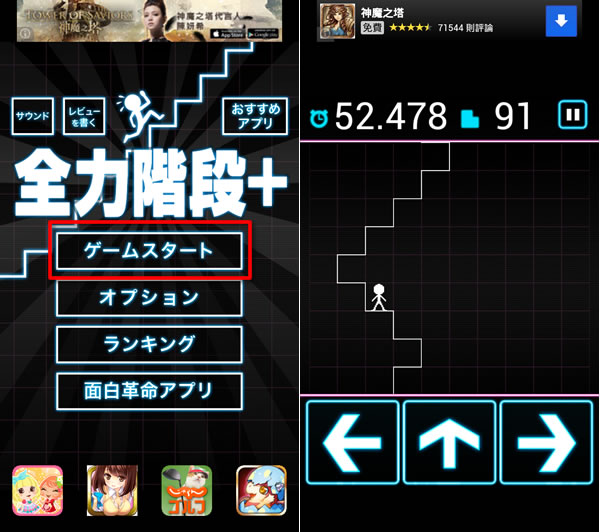 首頁移動設備學習資源 iStair+ 訓練大腦與手指反應力的遊戲(全力階段+) iStair+ 是一套 Andoid 的遊戲,遊戲的場景與規則都相當簡單,就是利用手指按畫面上的上、左、右箭頭來指揮小人爬樓梯,非常適合在有空閒的時間內來玩,且遊戲會跟全世界的玩家一起進行排名。 🔔 不錯過任何精彩! 立即訂閱我們的 LINE 官方帳號 每次發佈新文章時,您將會第一時間收到本站文章連結通知,輕鬆掌握最新資訊! 使用 LINE 追蹤文章更新 §相關文章,還可以參閱:「國中英語補救教學」國中七、八、九年級課文語音+字詞、句型與聽力練習+1200 單字[ Android ]聽憲法、行政 - 讓你用聽的就能背法條PhotoMath 透過照相機輸入數學算式,並列出解題步驟﹝Android﹞MyScript Calculator 可用手寫算式的計算機注音查詢 - 查詢字的注音符號與漢語拼音 如何使用 iStair+ ? 1.點擊黃色輸入框來輸入暱稱(會用在排名,可用中文),接下來會出現操作說明。 2.點擊第一個選項即可開始遊戲;若覺得箭頭太大想要更改,可透過第二個選項來更改箭頭的大小。 3.遊戲終了,可看見自己的紀錄或世界排名。 iStair+APP性質:免費官方網站:https://play.google.com/store/apps/details?id=net.capsuleplus.FastStairPlus