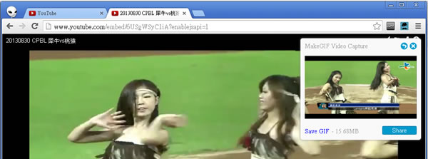 首頁移動設備生產力工具 MakeGIF Video Capture 將正在瀏覽器播放的影片製作成 GIF 動畫 - 瀏覽器擴充功能 針對正在網頁內播放的影片,若想要將其製作成 GIF 動畫格式來播放,大都需要將該影片下載回自己的電腦內,再透過其他軟體來製作。若你是使用 Google Chrome 瀏覽器,現在可以來安裝 MakeGIF Video Capture 這個 Chrome 瀏覽器擴充功能,讓正在網頁中播放的影片(例如 Youtube),輕鬆製作成 GIF 動畫格式,讓你後續好應用。 🔔 不錯過任何精彩! 立即訂閱我們的 LINE 官方帳號 每次發佈新文章時,您將會第一時間收到本站文章連結通知,輕鬆掌握最新資訊! 使用 LINE 追蹤文章更新 §相關文章,還可以參閱:Phone On Web 免任何安裝就可以在瀏覽器內使用滑鼠與鍵盤操作手機的各項功能「Edge」如何在手機內捲動瀏覽畫面做長截圖?如何使用 Android 內建鏡頭將文件掃描成 PDF 檔案?1Timer 有語音報時的 App如何在 Android 上使用 Chrome 擷取完整的網頁截圖? 如何安裝及使用 MakeGIF Video Capture? 1.使用 Chrome 瀏覽器到達 MakeGIF Video Capture 安裝網址後,按下[免費]便會開始下載及安裝。 2.安裝完成後,會出現提示。 3.以 Youtube 網站為例,當到達播放的影片網址後,點擊[MakeGIF Video Capture ]圖示,會要求轉換成 HTML5 的播放模式,依其指示轉換。 4.轉換完成後,便會重新以 HTML5 模式來播放影片,再次點擊[MakeGIF Video Capture ]圖示,便可設定或開始製作 GIF 動畫。 5.點擊[Done]按鈕後,便會出現預覽,點擊[Save GIF]便可儲存。 以上製作的 GIF 展示(點擊另開新視窗展示) MakeGIF Video CaptureAPP性質:免費官方網站:https://chrome.google.com/webstore/detail/makegif-video-capture/cnhdjbfjheoohmhpakglckehdcgfffbl/related