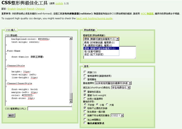 首頁線上工具開發工具 CleanCss - CSS 語法格式化與最佳化線上工具 CSS 是可以用來控制網頁排版的一種語法,多數的網頁開發工具,均有內建的 CSS 編排功能來協助排版,即便是沒有,也可以利用記事本寫出。想要讓自己寫出的 CSS 語法更容易閱讀,在傳輸的過程中檔案能更小,以便加快網頁的呈現速度時,可以來利用 CleanCss 網站所提供的 CSS Formatter and Optimiser 這個可將 CSS 語法格式化與最佳化的線上工具,只需將寫好的 CSS 語法複製並貼上,便能取得經過格式化與最佳化的 CSS語法。 🔔 不錯過任何精彩! 立即訂閱我們的 LINE 官方帳號 每次發佈新文章時,您將會第一時間收到本站文章連結通知,輕鬆掌握最新資訊! 使用 LINE 追蹤文章更新 §相關文章,還可以參閱:網站效能健檢免費工具!PageTest 多裝置模擬效能分析及由 AI 提出改進建議Regex-Vis 圖解正則表達式的線上工具,可編寫還可驗證Sitemap Generator:線上快速產生符合 SEO 標準的網站地圖,無網址數量限制適用各類型網站網站隱私權政策產生器 Privacy Policy Generator:輸入網站名稱和網址即可輕鬆生成專屬條款Frame0:輕鬆繪製應用程式流程圖、UML 和介面雛形的免費工具,適用於 macOS 與 Windows 如何使用 CleanCss? 1.使用瀏覽器進入上述網址後,將所複製好的 CSS程式碼,貼到 CSS 輸入欄內,接下來選擇原始碼規則及勾選合適的選項,點擊[執行]。 2.接下來便會在其下方出現經過格式化與最佳化的程式碼,供你使用。 CleanCss網站網址:https://www.cleancss.com/?lang=en